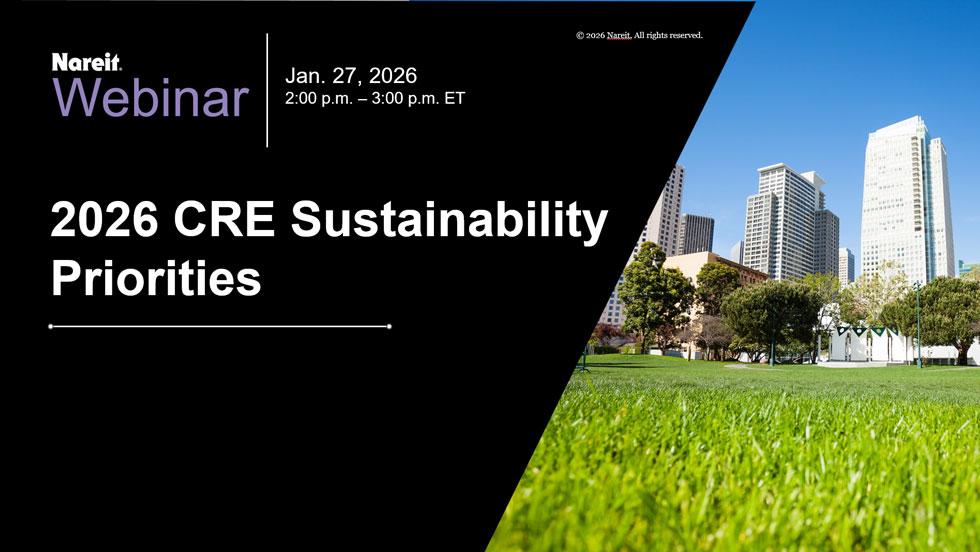 Nareit’s CRE Sustainability Priorities 2026 webinar on Jan.27 explored the main themes of REIT sustainability programs for the coming year. Nareit’s Jessica Long, senior vice president for environmental stewardship & sustainability, moderated the discussion with Chris Laz, vice president, sustainability, at Realty Income Corp. (NYSE: O) and chair of Nareit’s Real Estate Sustainability Council (RESC), and Lauren Moss, chief sustainability officer at Vornado Realty Trust (NYSE: VNO) and RESC vice chair.