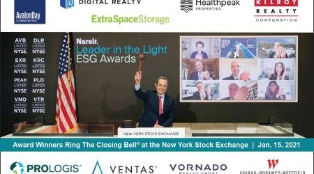 The New York Stock Exchange invited representatives from the Nareit Leader in the Light Award winners to virtually ring The Closing Bell®, Friday, Jan. 15, 2021, in celebration of their achievements in ESG and sustainability, and to recognize the 15th anniversary of the awards.