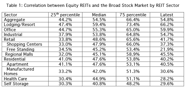 Demonstrating the benefits of REIT-based real estate investment in terms of asset class diversification, over the past 20 years the correlations between the broad exchange-traded Equity REIT industry and the broad stock market has usually been between 44.2% and 66.4%, with a median of 54.5%. (I use monthly total returns from the FTSE NAREIT All Equity REITs Index and the Russell 3000 Stock Index, along with a DCC-GARCH empirical methodology, which provides estimates of the correlation during each month over the 20-year period.) Because different property types move differently from each other, however—as well as differently from the rest of the stock market—returns for a diversified portfolio of REITs in a given sector may be even less similar to the broad stock market than the REIT industry is as a whole.
