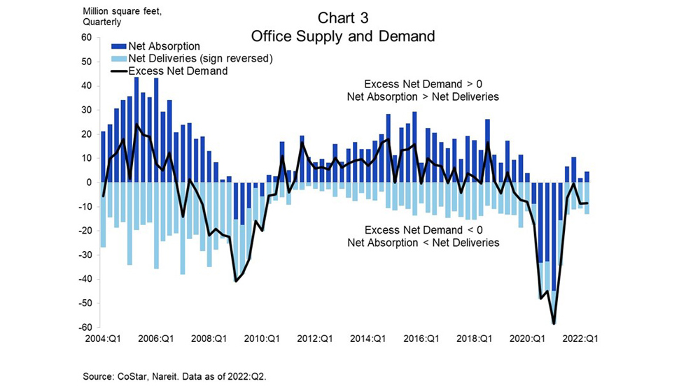 As displayed in Chart 2, the industrial sector has enjoyed high levels of demand with analogous supply responses. In the second quarter of 2022, net absorption and net deliveries equaled 98 million and 72 million square feet, respectively. Excess net demand has been positive for seven straight quarters.