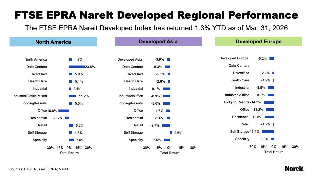 The FTSE EPRA Nareit Developed Index posted a total return of 1.3% through the first quarter of 2026, while the FTSE EPRA Nareit Developed Extended Index returned 0.9% for the same period. After a strong start to the year, global real estate momentum reversed in March, along with broad markets, as volatility related to rising energy prices amid conflict in the Middle East weighed on returns.