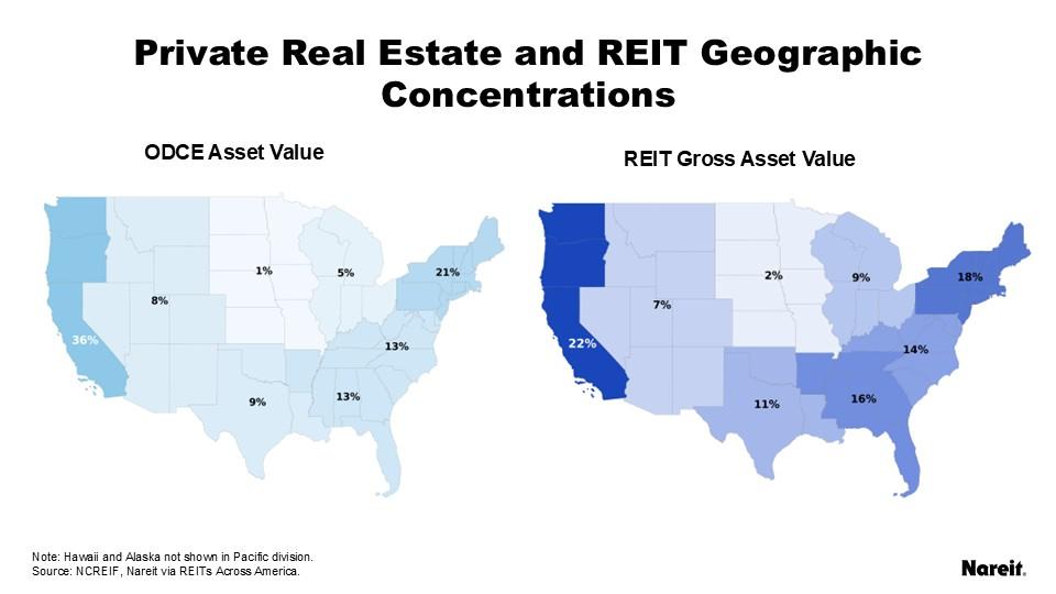 The maps above show each property type’s geographic distribution of value for ODCE and REITs.