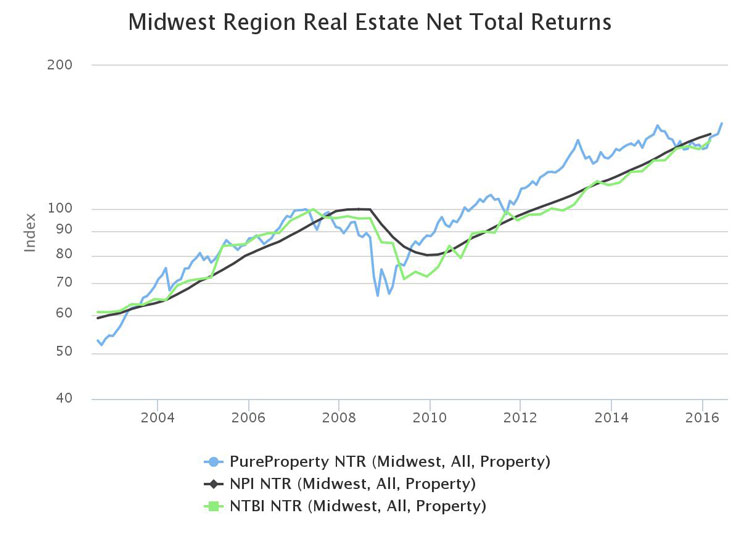Chart 2 shows how the index comparison tool can be used to focus on a segment of the market—in this case real estate in the Midwest Region over the entire available historical time period from 2002Q3 through 2016Q2. This chart displays three available indices on a logarithmic scale: