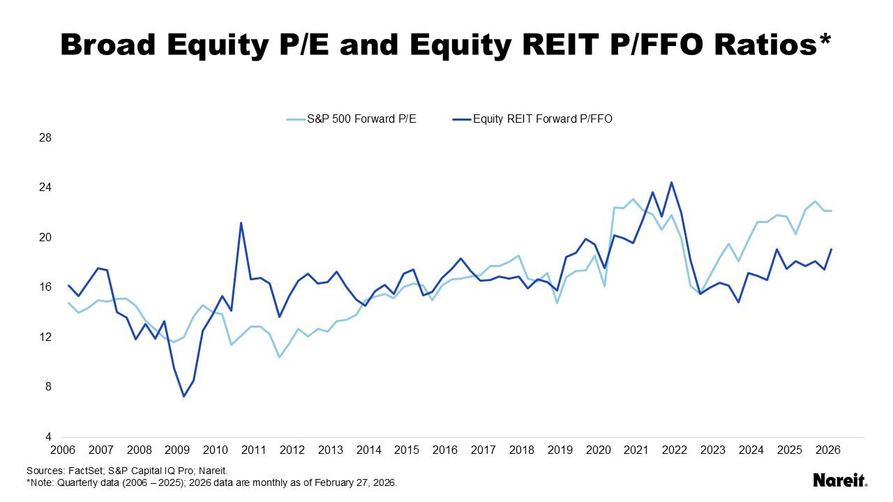 In the first two months of 2026, the FTSE Nareit All Equity REITs Index and S&P 500 Index realized total returns of 10.5% and 0.7%, respectively. REITs outperformed the broad equity market by 9.8%. Not surprisingly, the gap between the S&P 500 P/E and equity REIT P/FFO ratios tightened over this time. With the start of the Iranian conflict, both REIT and S&P 500 total returns have tempered, but REITs have maintained a 9.6% year-to-date total return advantage as of March 17.