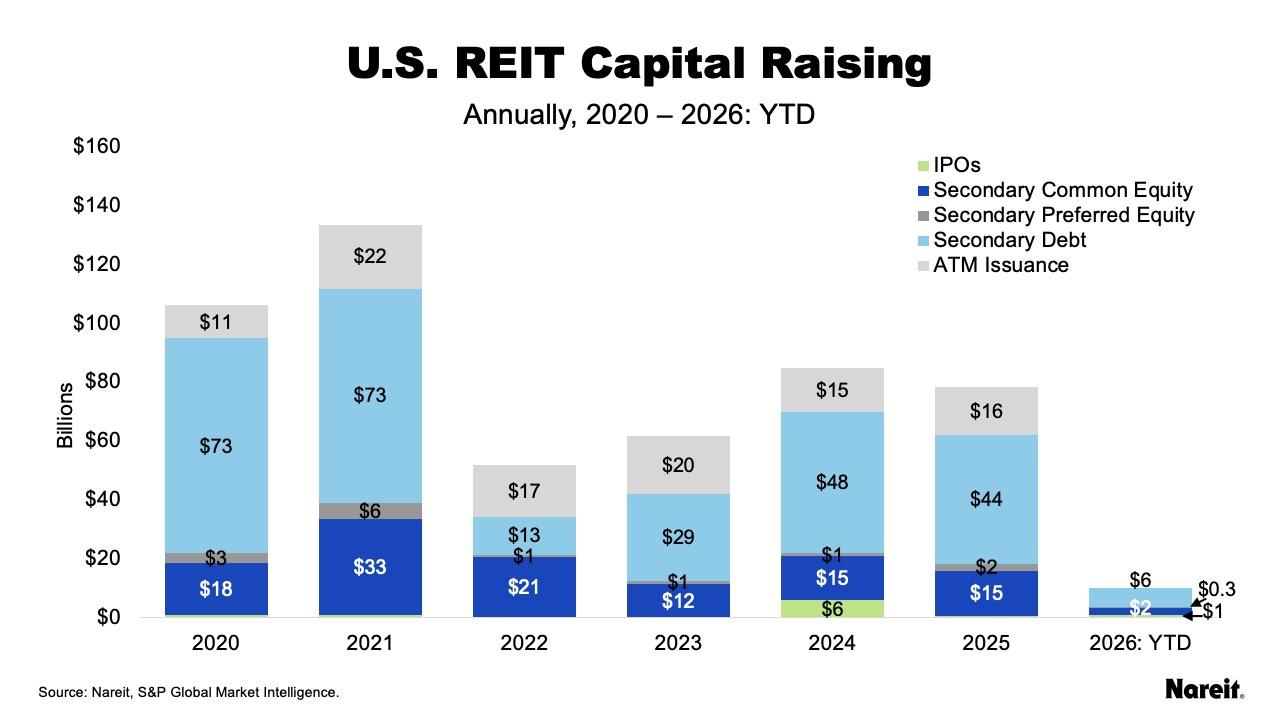 REITs have raised approximately $10 billion in 2026, a figure that does not include first quarter ATM issuance due to a lag in reporting. This total represents a $2.2 billion decrease over the same period in 2025, when REITs raised $12.2 billion. In 2025, REITs raised $78.4 billion in the capital markets, down slightly from the $84.7 billion raised in 2024.