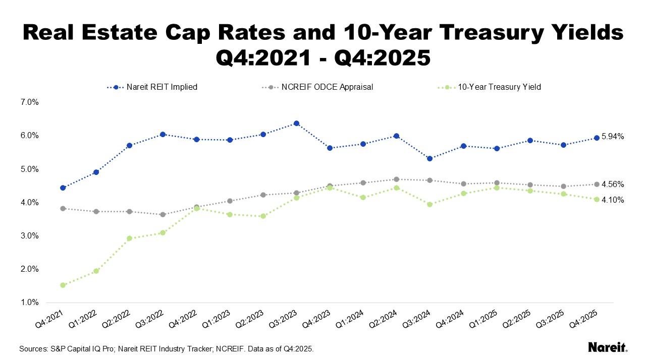 The tenure of the current public-private real estate valuation divergence has now reached four years. As of the fourth quarter of 2025, the REIT implied and private real estate appraisal cap rates were 5.94% and 4.56%, respectively, resulting in a spread of 138 basis points. Highlighting private real estate appraisers’ and portfolio managers’ inaction, the appraisal cap rate has been essentially unchanged since the end of 2024. It has also continued to maintain a very modest spread over the 10-year Treasury yield; this is an untenable relationship.