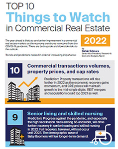Prediction: Property transactions will rise further in 2022 as the economic recovery gains momentum, and CRE prices will maintain growth in the mid-single digits. REIT mergers and acquisitions could top 2021 as well.