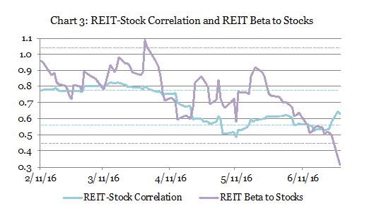 As shown in Chart 3, the post-Brexit turmoil actually increased the REIT-stock correlation (as shown by the blue line) from 0.535 to 0.631—still less than the median value of 0.67 since the beginning of 1999—but since the spike in volatility was almost entirely confined to non-REIT stocks, REIT beta relative to the broad stock market (as shown by the purple line) actually dropped dramatically from 0.52 to 0.31. That means that REITs have accomplished the holy grail of investing, reducing the volatility of a stock portfolio while increasing its value too: for example, a portfolio evenly divided between exchange-traded Equity REITs and the broad stock market since February 11 would have seen 37% greater returns, but 9% less volatility, than a portfolio with no more than the standard market-cap weighting to REITs.