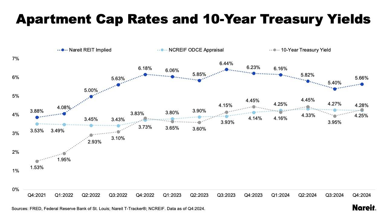 The chart above presents apartment REIT implied and private appraisal cap rates from the fourth quarter of 2021 to the fourth quarter of 2024 using data from Nareit’s REIT Industry Tracker and NCREIF ODCE funds. It also exhibits average quarterly U.S. 10-year Treasury yields.