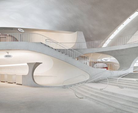 MCR created the TWA Hotel from the headhouse of the original airport terminal, which opened in 1962. Two new wings, which house 512 guest rooms, sit behind the historic building.